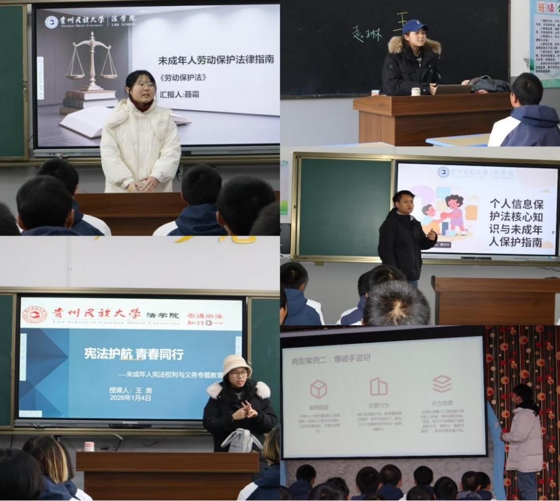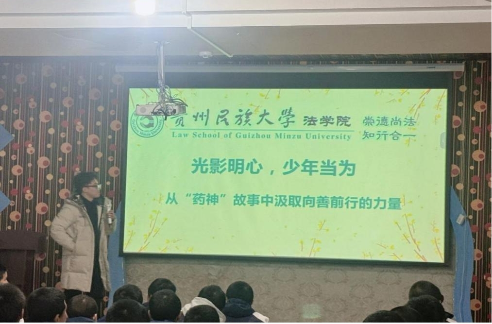 2025年1月4日,冬日的盘州市阳光学校暖意融融。bw必威西汉姆联教工第一党支部、研究生第三党支部、研究生第四党支部“守护明天始于心,法治护航践于行”法治宣讲团一行,带着精心筹备的普法课程与趣味法治活动,走进这所专门教育学校,为罪错未成年人开启为期七天的普法宣讲活动。首日课程以“法律知识传授+德育课程+互动游戏体验+影视法治感悟”为核心,将严肃的法律条文转化为鲜活的教学内容,为迷途少年们搭建起一座通往法治世界的桥梁。