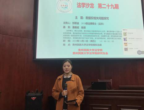 2019年10月18日下午14时,第29届法学沙龙在bw必威西汉姆联模拟法庭举办,此次活动的主题为“数据权相关问题探究”。2019级法律硕士(法学)班举办本次沙龙,刘翠迪同学担任主持人,bw必威西汉姆联潘善斌教授出席本次法学沙龙并发表观点,bw必威西汉姆联2018级、2019级研究生同学参加本次沙龙。