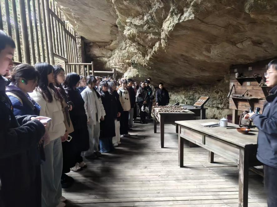 讲解员向党员和积极分子讲解“猫洞”的故事