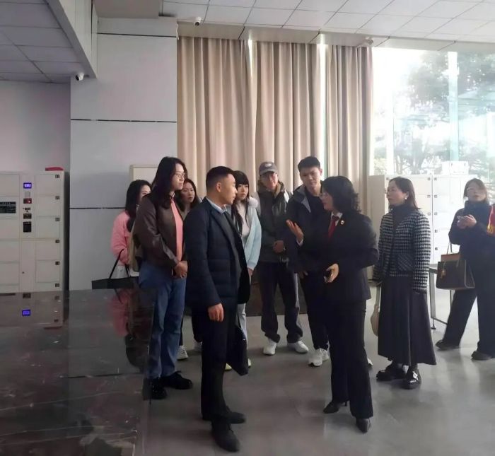 随后,大家依次参观了法院诉讼服务中心及审判法庭。在诉讼服务中心,工作人员详细介绍了跨域立案、网上调解等便民举措的运行机制,让大家直观了解智慧法院建设为群众带来的便利。在审判法庭内,法官系统阐释庭审流程、司法礼仪、合议庭运行规则等制度,结合民生案件审理逻辑讲解“以事实为依据、以法律为准绳”的司法原则,让师生们切实感受司法工作的规范性与权威性。